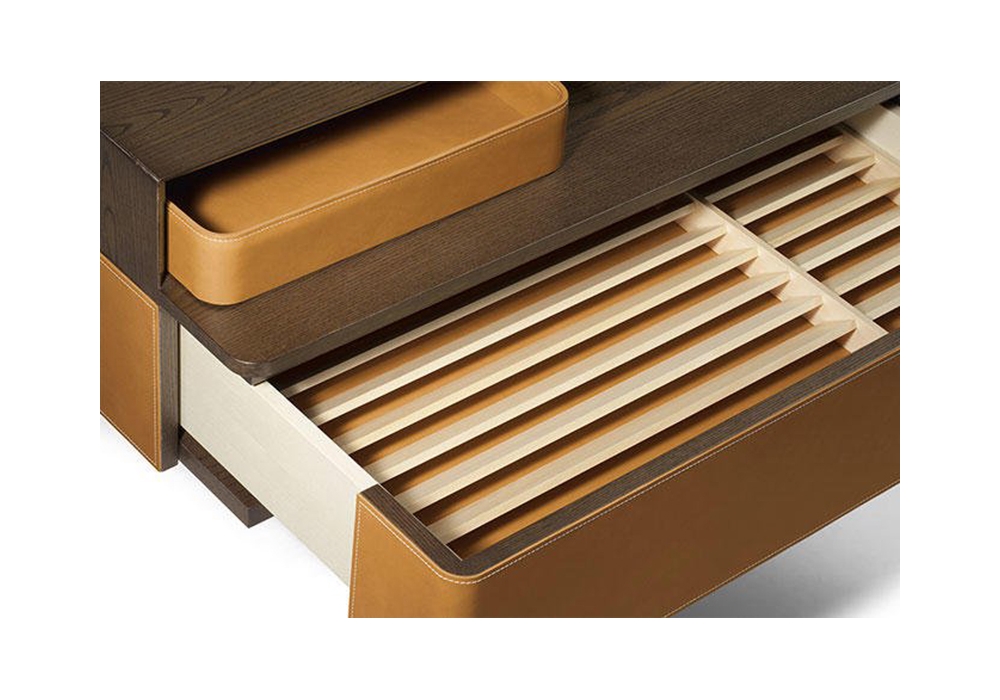 Fidelio Multimedia Cabinet conçu par Roberto Lazzeroni pour Poltrona Frau est un buffet avec plateau en bois de frêne teinté moka et revêtement en cuir Cuoio Saddle ou Cuoio Saddle Extra disponible en différentes finitions.