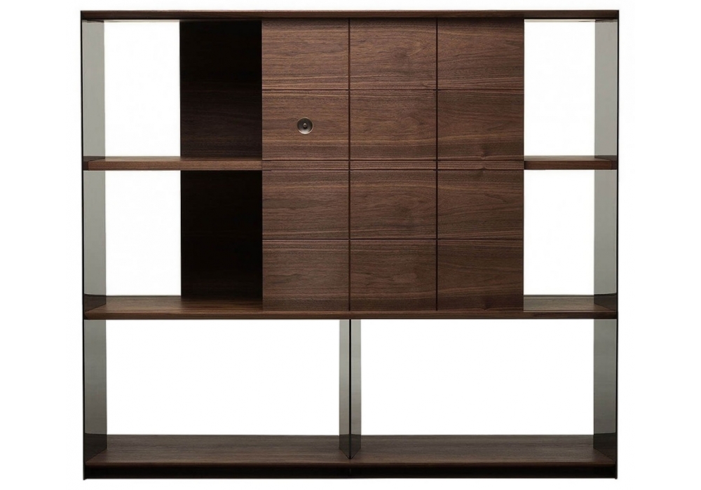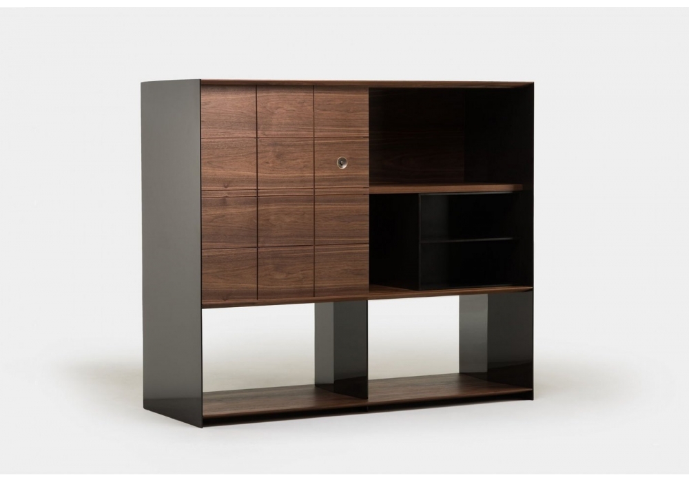 Mitch conçu par Luca Nichetto pour De La Espada est un meuble de rangement en bois avec portes coulissantes, panneaux verticaux en HDF et détails en laiton brossé.