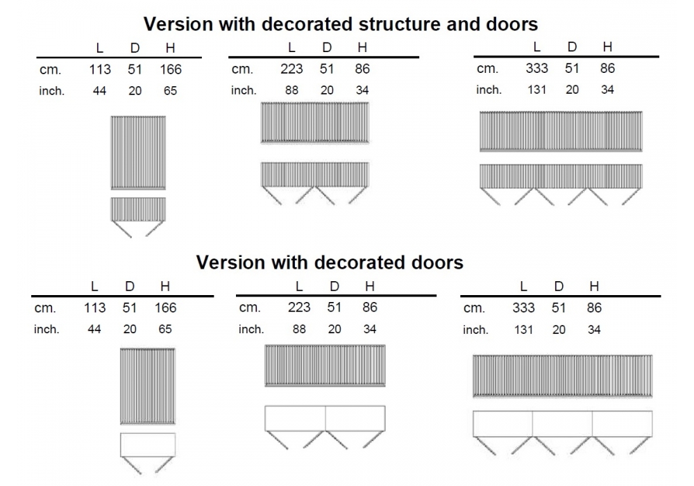 | Dimensions | L 113 x 51 x H 166 cm (2 portes); L 223 x 51 x H 86 cm (4 portes); L 333 x 51 x H 86 cm (6 portes) |