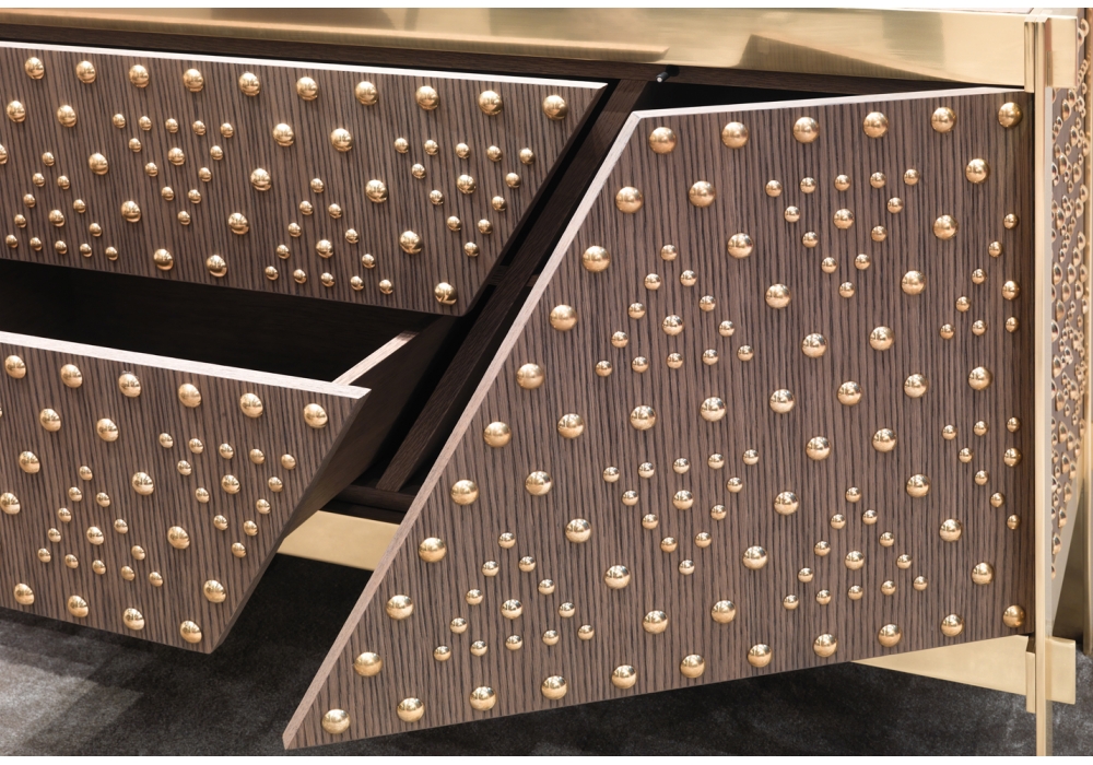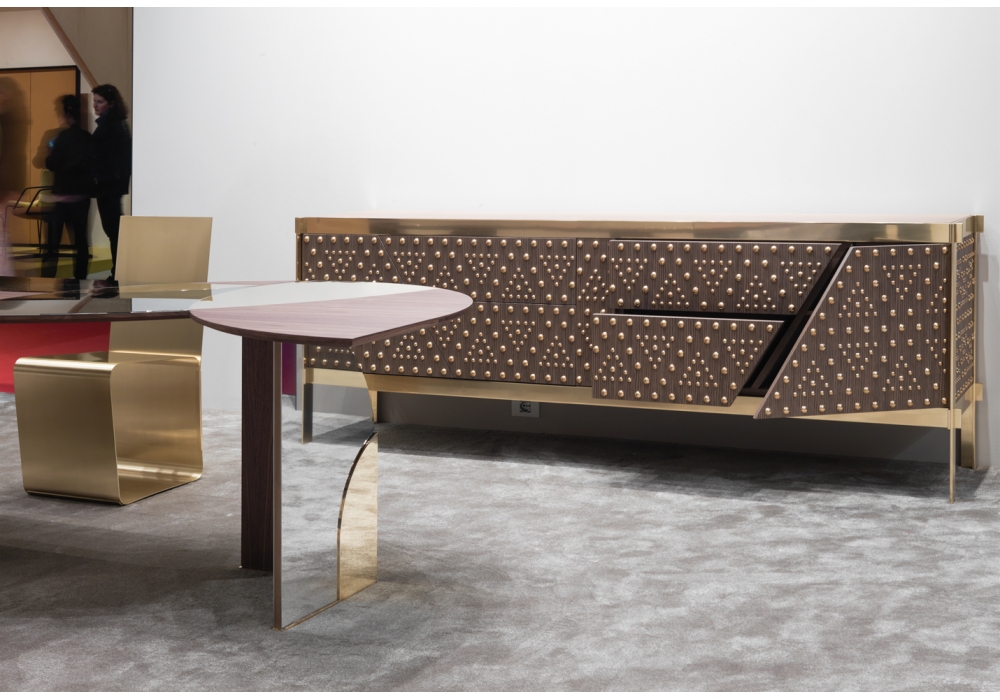 Dolly conçu par Ferruccio Laviani pour Emmemobili est un bahut réalisé avec panneaux contreplaqués et structure en laiton. La façade et les côtés sont décorés avec des boutonts en laiton, de différents diamètres. Disponible en 2 modèles: avec portes ou avec portes et tiroirs. Espaces intérieurs équipés d'une étagère en bois chacun.