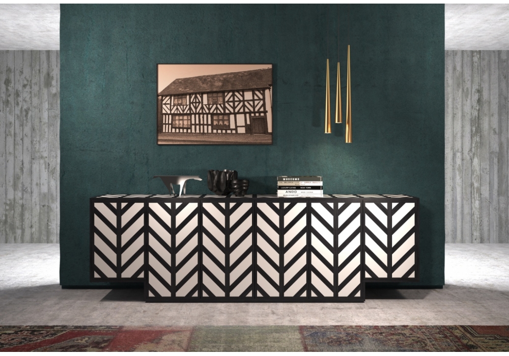 Tudor conçu par Ferruccio Laviani pour Emmemobili est un buffet avec structure réalisée en bois massif de sapin sablé et inserts en HDF laqué. Étagères en bois massif. Deux versions disponibles: avec dessus décoré ou lisse.