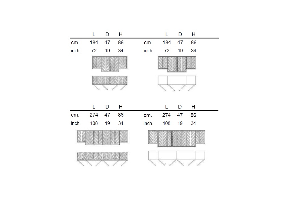 | Dimensions | L 184 x W 47 x H 86 cm (4 portes); L 274 x W 47 x H 86 cm (6 portes) |