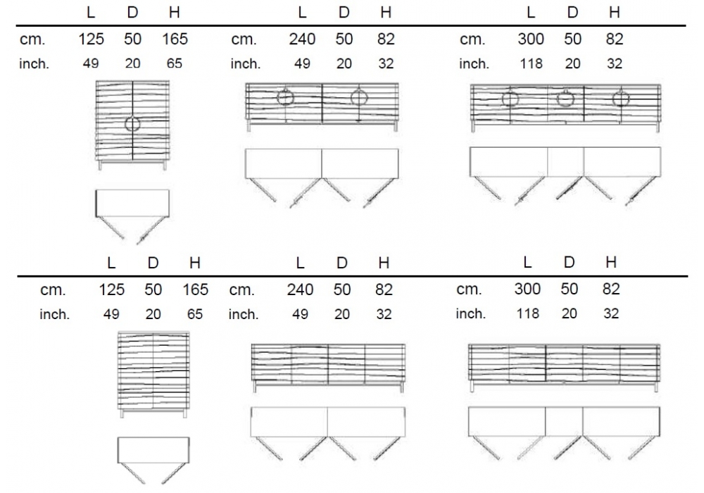 | Dimensions | L 125 x W 50 x H 165 cm (2 portes); L 240 x W 50 x H 82 cm (4 portes); L 300 x W 50 x H 82 cm (5 portes) |