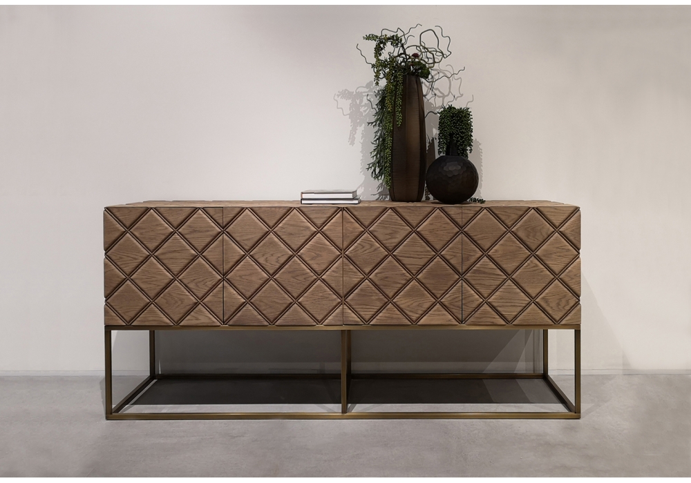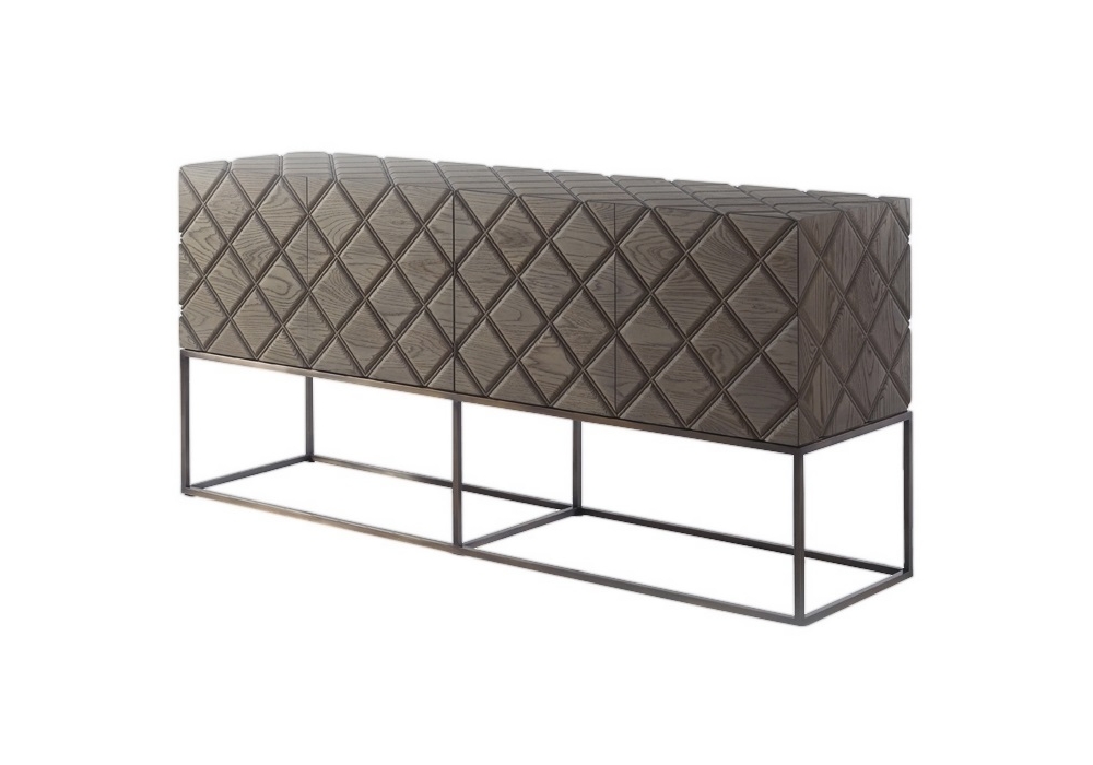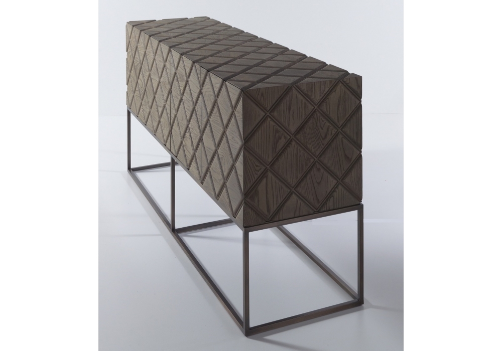 Tiberio Matelassè von Ferruccio Laviani para Emmemobili est un bahut réalisé avec panneaux contreplaqués avec des éléments en bois plaqués multicouches, traité effet matelassé. Base en laiton brossé poli à la main et parties intérieures dans le même placage de la structure. Disponible aussi en 3 dimensions.