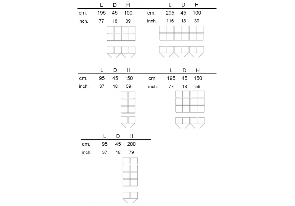 | Dimensions | L 195 x W 45 x H 100 cm (4x2); L 295 x W 45 x H 100 cm (6x2); L 95 x W 45 x H 150 cm (2x3); L 195 x W 45 x H 150 cm (4x3); L 95 x W 45 x H 200 cm (2x4) |