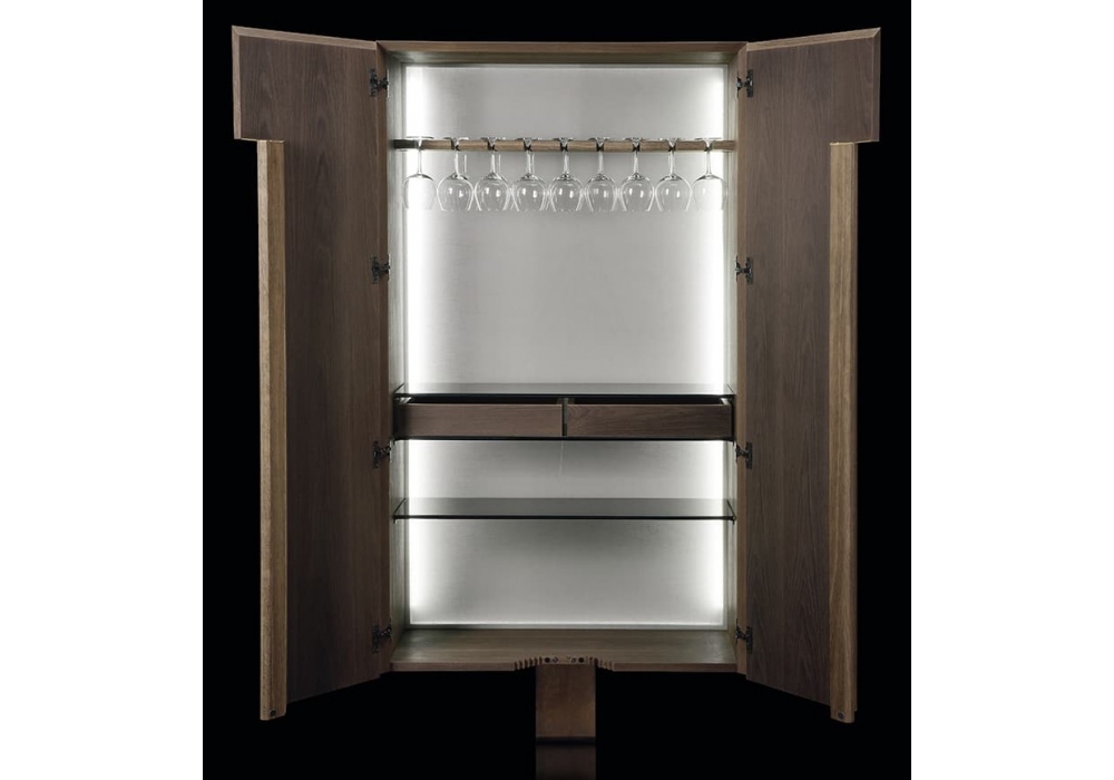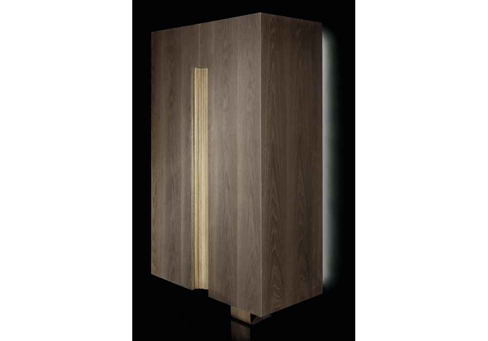Frame Cabinet conçu par Massimo Castagna pour Henge est un meuble de rangement avec fixation murale, structure et portes en bois traité thermiquement, base en laiton bruni à la main. Étagères en verre trempé bronzé. Disponible en deux modèles. Éclairage LED disponible sur demande.
