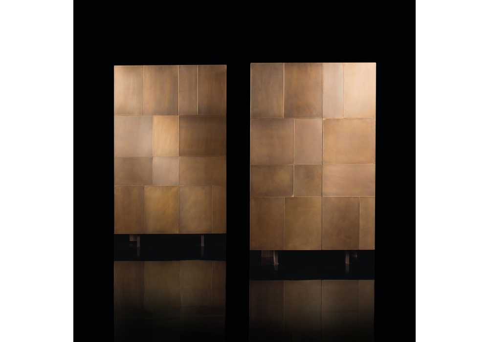 Slim Side Vertical conçu par Massimo Castagna pour Henge est un meuble de rangement avec structure en contreplaqué de 2,5 cm d'épaisseur, revêtue de la finition métallique sélectionnée. Étagères intérieures en verre bronze. Disponible en deux versions. Éclairage LED disponible sur demande.
