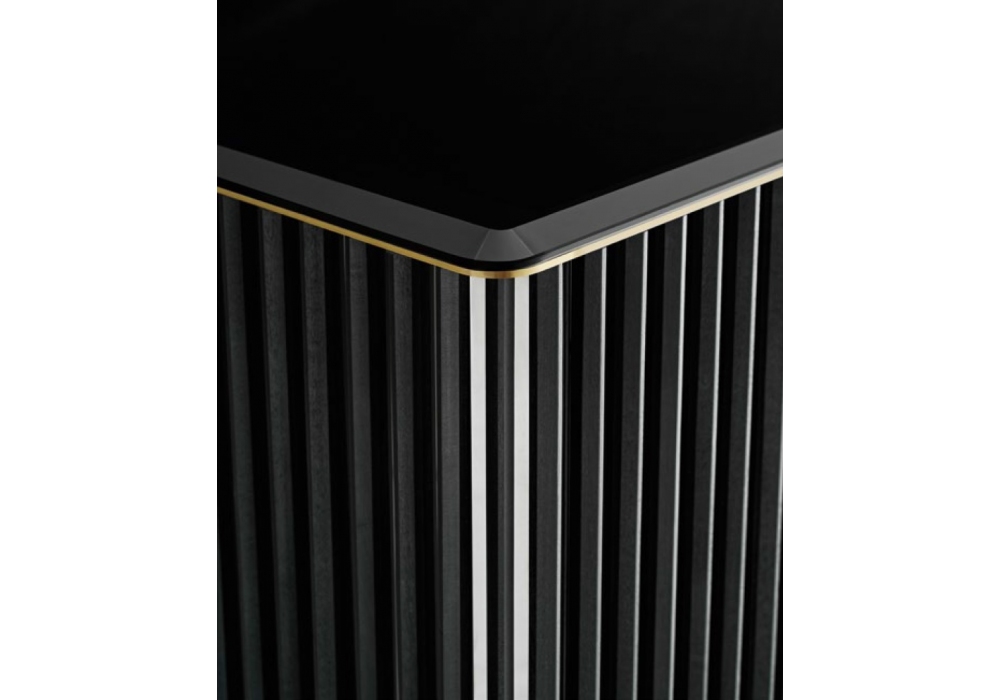 5th Avenue conçu par Marcello Pozzi pour Gallotti&Radice est un buffet en bois recouvert en acier inox brillant “supermirror” avec liteaux en frêne massif laqué noir pore ouvert. Base en frêne laqué noir pore ouvert et partie interne recouverte d’acier inox "supermirror". Plateau avec biseau en verre "grigio Italia" fumé de 12mm d’épaisseur verni noir brillant et détail en laiton satiné sous le plateau. Avec étagère en verre extralight et fond interne en verre extralight miroité de6mm d'épaisseur.