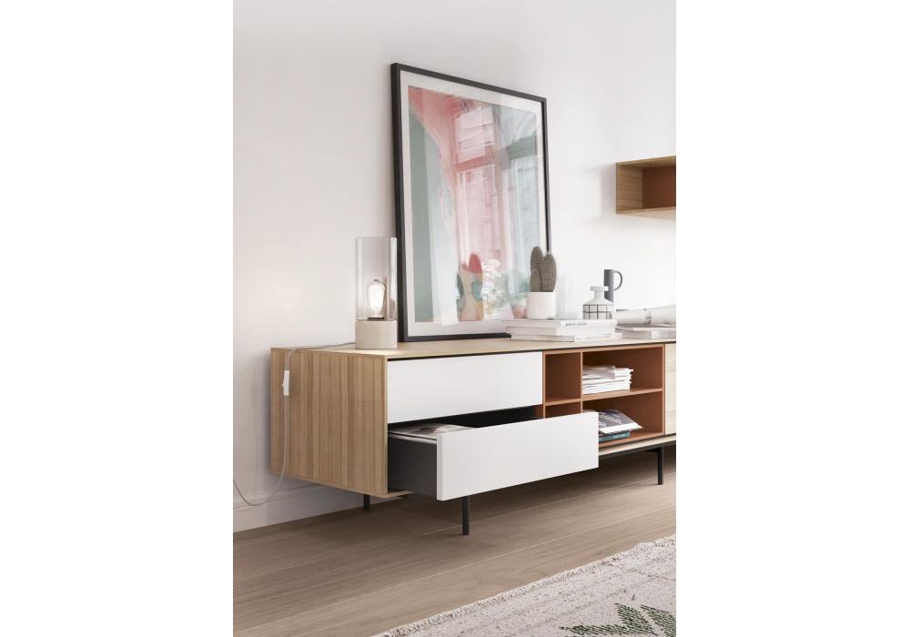 Aura conçu par Angel Martí et Enrique Delamo pour Treku est un buffet de la collection Aura. La composition sur des jambes en métal a une structure en bois, avec deux portes, deux tiroirs et quatre compartiments ouverts. L'unité murale séparée est incluse.