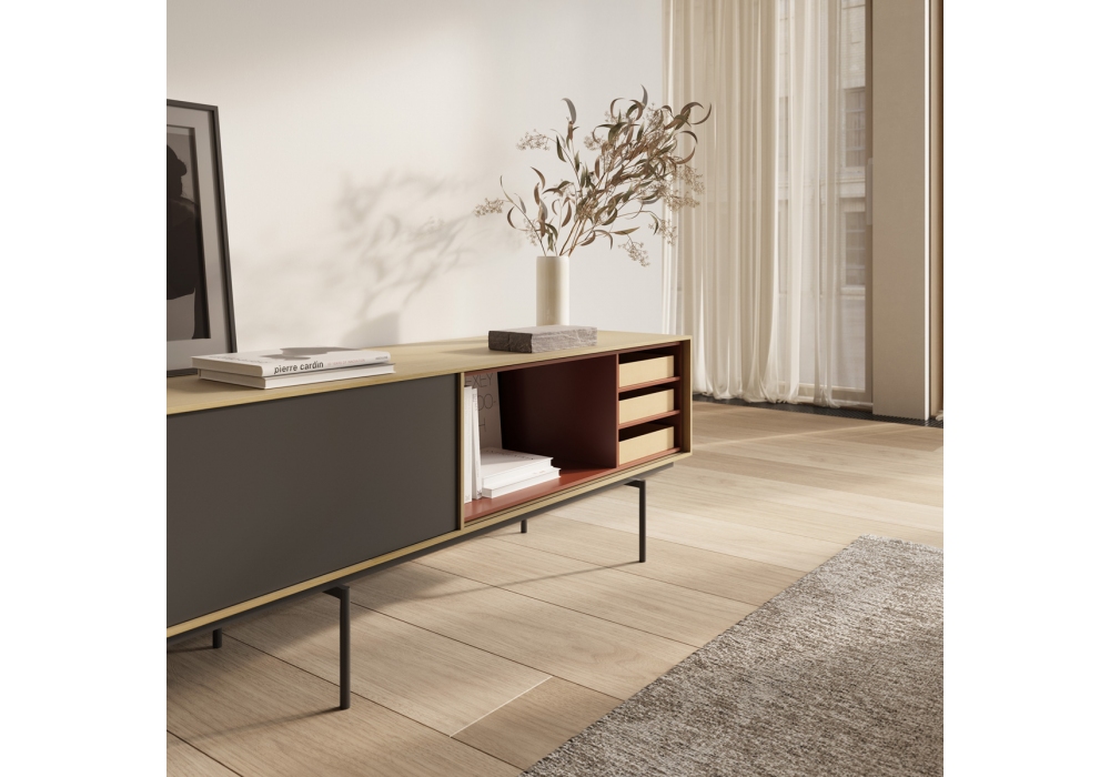 Aura conçu par Angel Martí et Enrique Delamo pour Treku est un buffet de la collection Aura. La composition comprend une structure en bois sur des pieds en métal, des tiroirs en finition bois, des compartiments ouverts et une porte coulissante en finition laquée avec poignée en bois. Accessoires trois plateaux en tissu pour le compartiment ouvert.