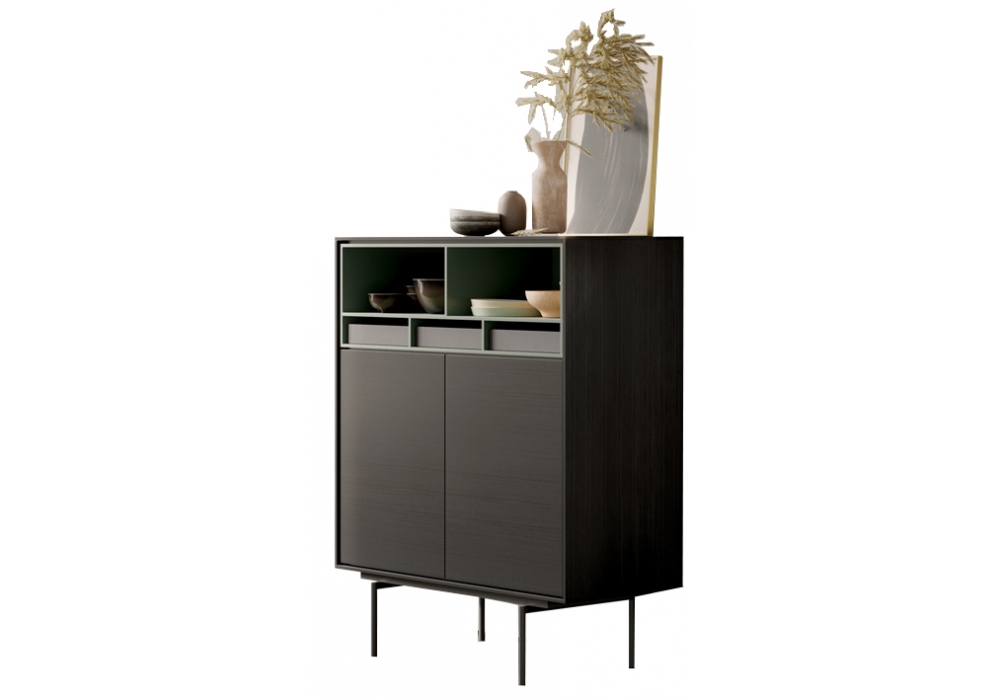 Aura conçu par Angel Martí et Enrique Delamo pour Treku est un buffet haut de la collection Aura. La composition présente une structure en bois sur des pieds en métal, un compartiment ouvert en finition laquée, deux modules avec une porte en finition bois. Accessoires trois plateaux en tissu pour le compartiment ouvert.