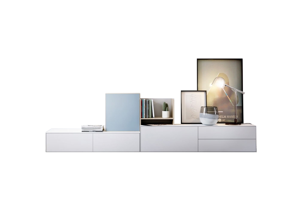 Lauki conçu par Ibon Arrizabalaga pour Treku est un buffet de la collection Lauki. La composition présente une composition de modules reposant sur le sol en finition laquée, module à porte laquée et compartiment ouvert.