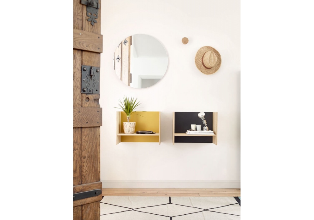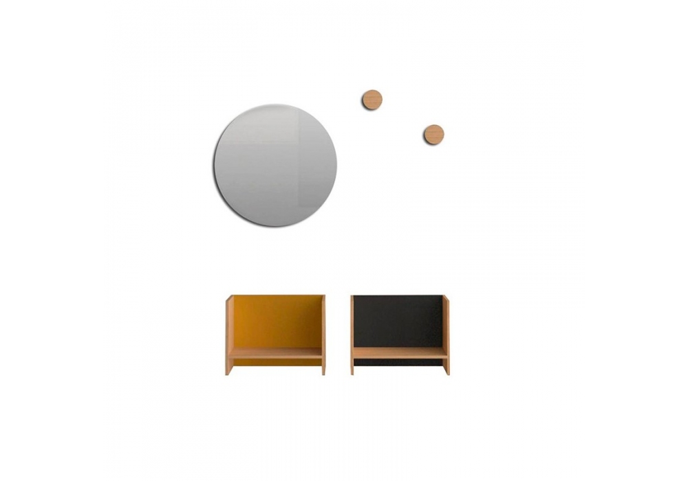 Lauki conçu par Ibon Arrizabalaga pour Treku est une composition de la collection Lauki, la configuration sur la photo comprend deux modules suspendus avec une structure en bois et une étagère laquée dans les différentes finitions, le miroir et deux cintres en bois.