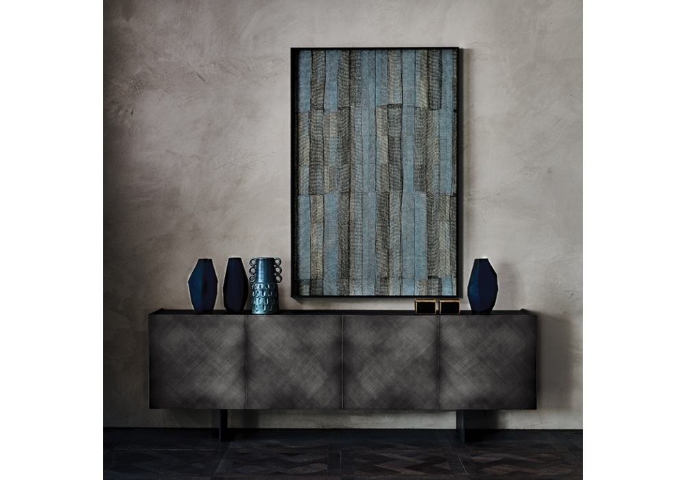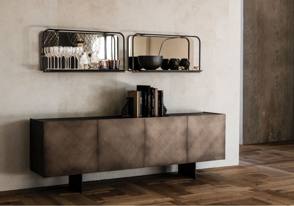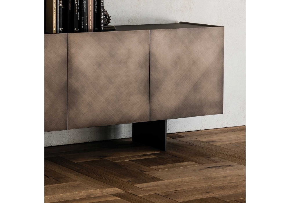 Arizona conçu par Alessio Bassan pour Cattelan Italia est un buffet réalisé en bronze brossé, plateau en verre et pieds en acier. Étagères intérieures en bois. Disponible en 6 modèles.