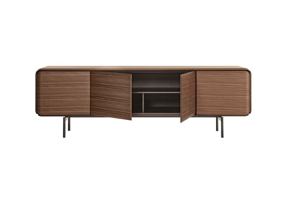 Pebble conçu par Niccolò Devetag pour Porada est un buffet en noyer canaletta avec quatre portes, ouverture push-pull et trois compartiments internes avec étagères en bois de frêne. Base en métal en finition étain poli.