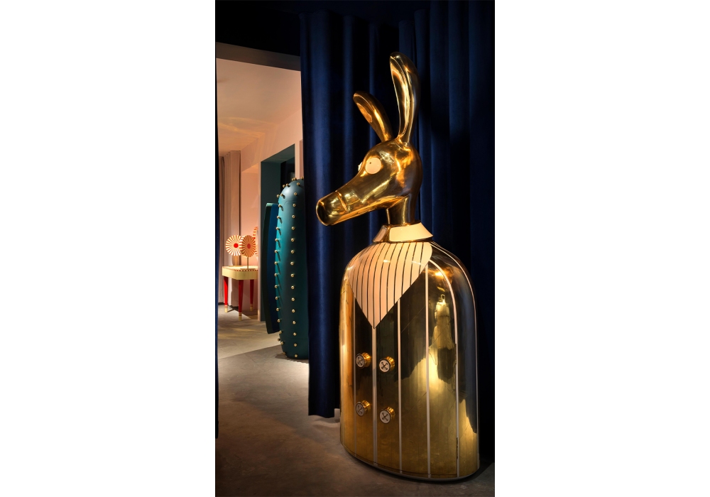 Ciuco conçu par Matteo Cibic pour Scarlet Splendour est un meuble de rangement en contreplaqué, laiton et résine.