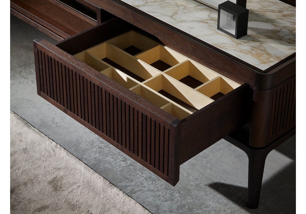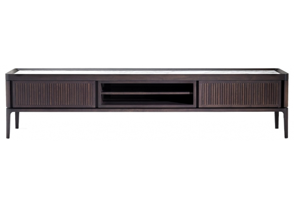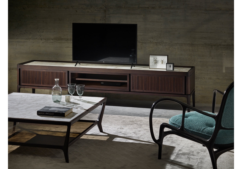 Full TV conçu par Roberto Lazzeroni pour Ceccotti Collezioni est un meuble en noyer américain massif et contreplaqué de peuplier plaqué. Portes, panneaux latéraux et façades de tiroirs revêtus en ébène, tissu, cuir ou laqué RAL (veuillez indiquer au Service Client la couleur choisie). Disponible la version extra avec portes, panneaux latéraux et façades de tiroirs recouverts de bandes de noyer américain massif. Intérieur en bois d'érable, plateau en bois, verre coloré ou marbre. Etagère centrale en verre et deux tiroirs. Gestion des câbles arrière. Sur demande accessoires internes.
