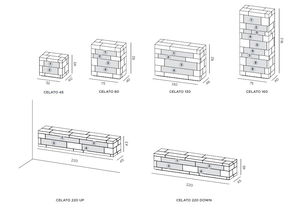 | Dimensions | • 52 x 40 x H 45 cm; • 75 x 40 x H 82 cm; • 130 x 46 x H 82 cm; • 75 x 40 x H 162 cm; • 220 x 45 x H 43 cm; • 220 x 45 x H 45 cm |