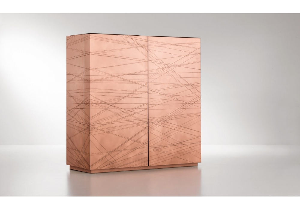 Graffio conçu par Paolo Benevelli pour DeCastelli est un meuble de rangement avec deux portes recouvertes de métal sur tous les côtés. Structure en bois de chêne naturel avec 2 tiroirs intérieurs. Disponible en différentes finitions.