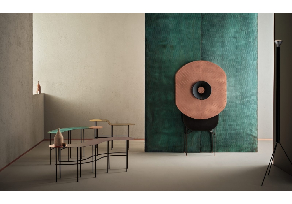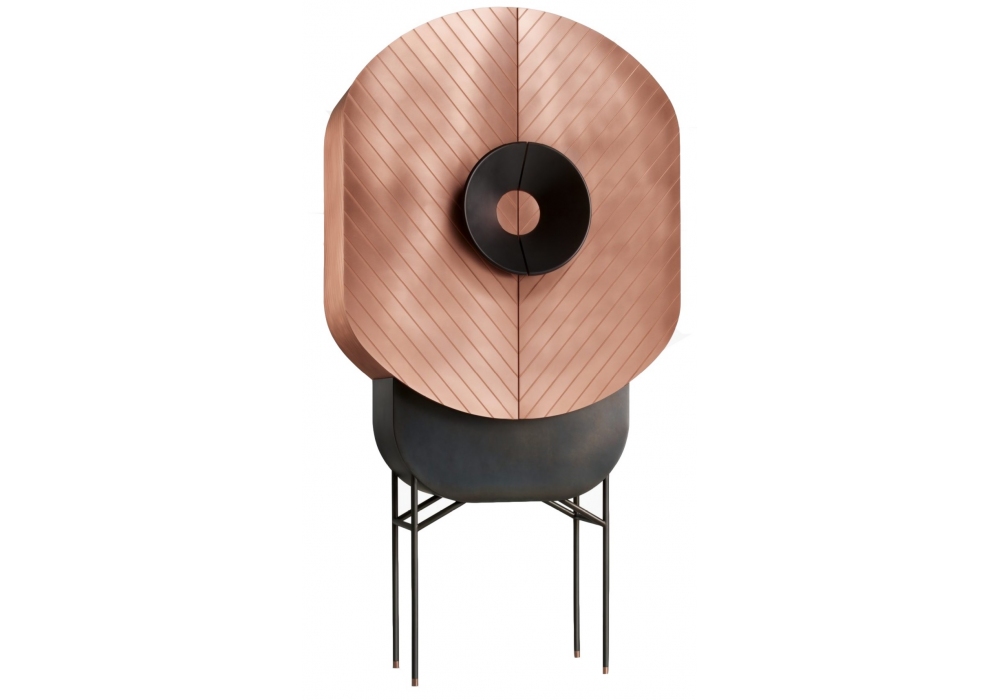 Polifemo conçu par Elena Salmistraro pour DeCastelli est un meuble de rangement avec deux portes battantes recouvertes de métal sur tous les côtés, avec fixation murale.