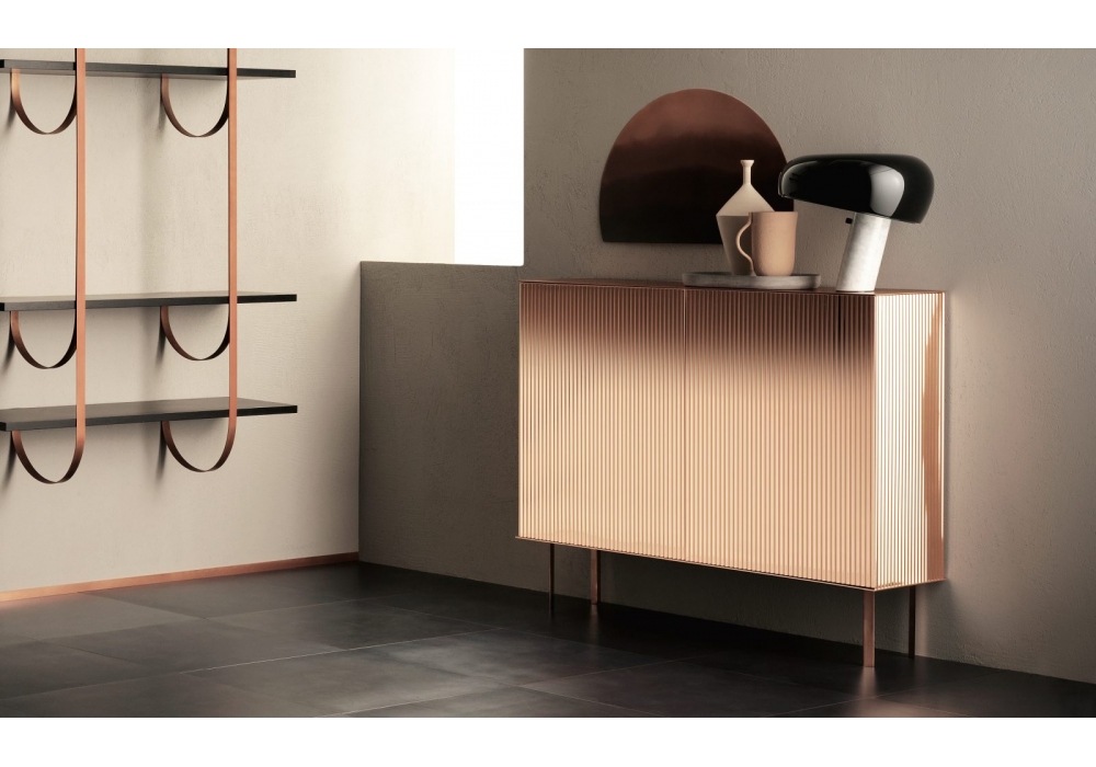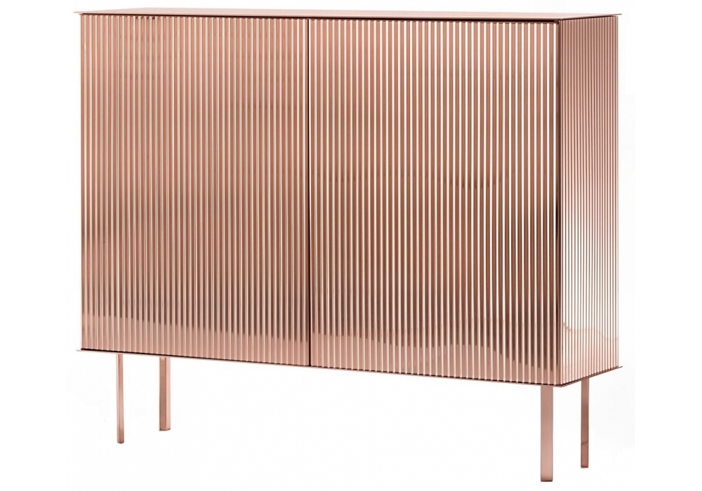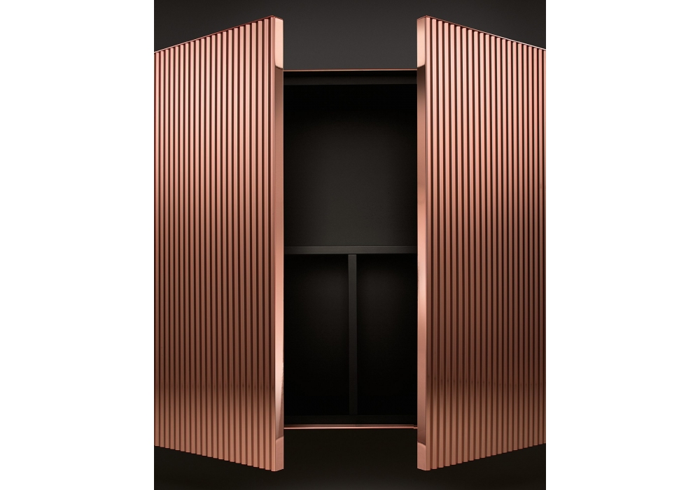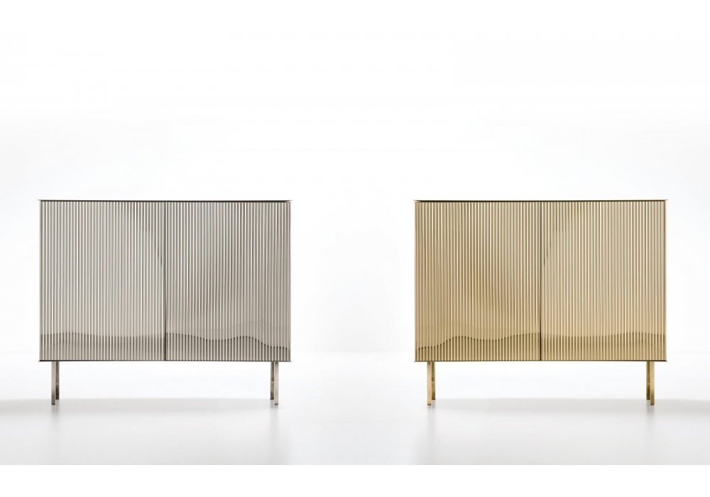 Elizabeth conçu par Nathalie Dewez pour DeCastelli est un meuble de rangement recouvert de métal plissé sur tous les côtés et structure interne en bois. Portes battantes avec ouverture push-pull. Disponible en différentes finitions.