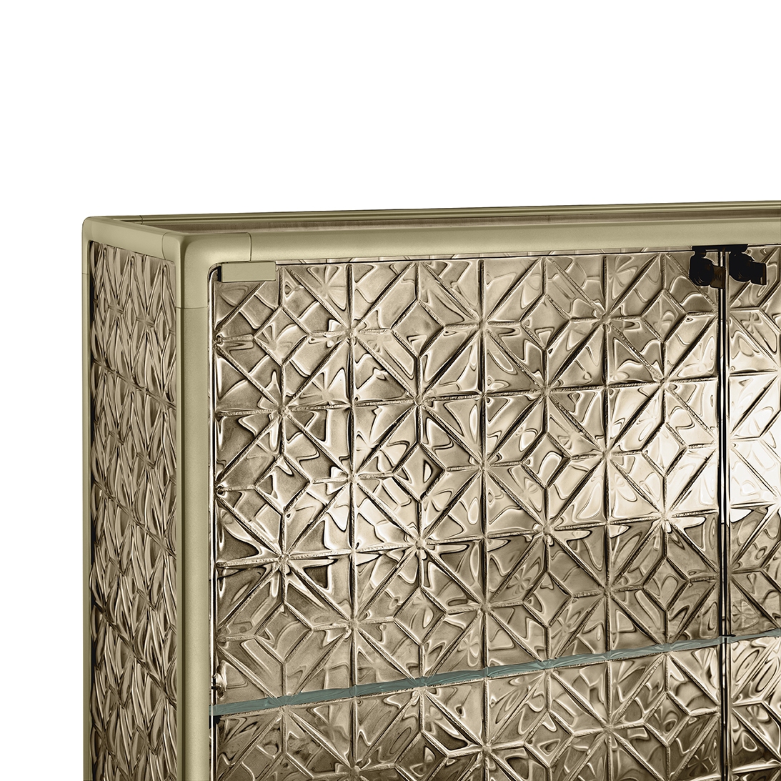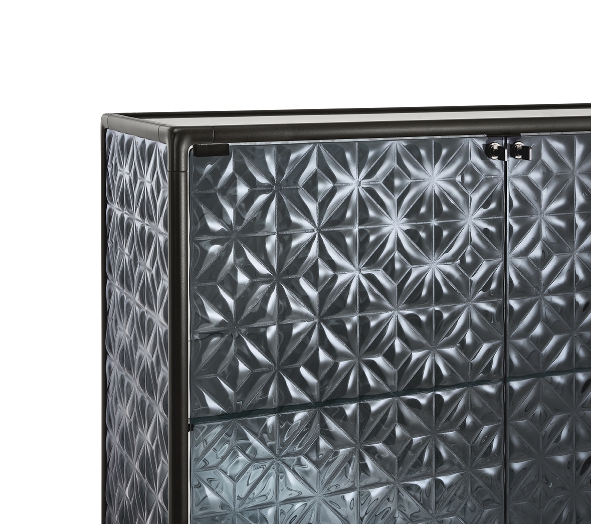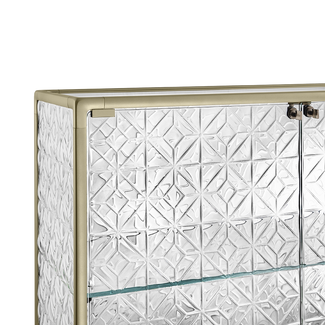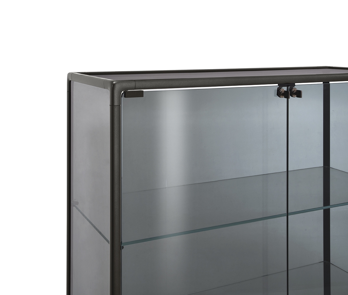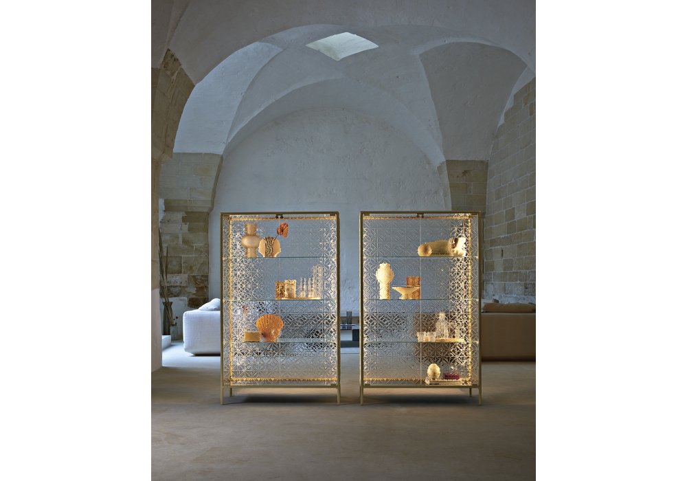 Echo conçue par Marcel Wanders Studio pour Fiam, est une vitrine avec structure en aluminium peint, base en verre extralight peint dans la même teinte que la structure, corps de vitrine et porte en verre. Disponible également dans la version avec système d'éclairage LED intégré dans les montants avant.
