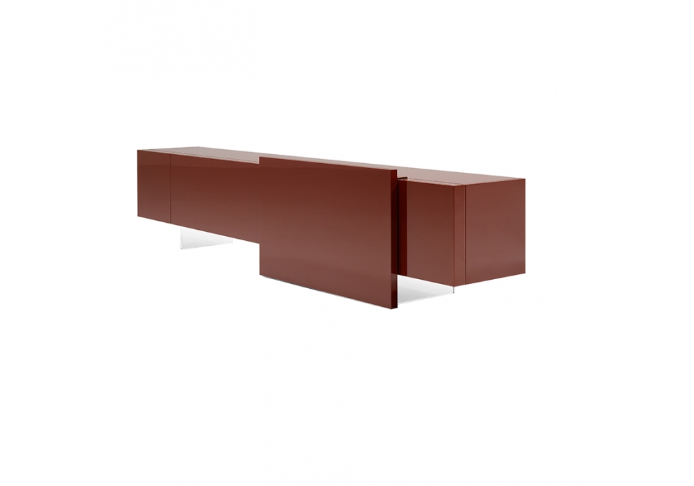 Alterego Low conçu par Giacomo Moor pour Acerbis est un buffet bas en base méthacrylate, structure et porte battante en bois ou porte laquée et coulissante dans différentes finitions contrastées.