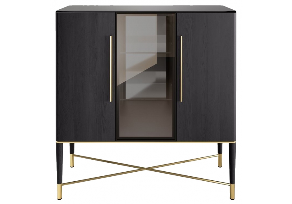 Tama Vitrine conçue par Carlo Colombo pour Gallotti&Radice est une crédence en frêne teinté noir pore ouvert. Partie métalliques laquées laiton satiné. Top en verre trempé et fond intérieur en verre de 6mm d’épaisseur, tous deux vernis réglisse brillant A l’intérieur fond avec gravure rhomboïdal. Equipé avec tablettes en verre trempé “grigio Italia” fumé de 8mm d’épaisseur. Porte centrale en verre de 4mm d’épaisseur et aluminium couleur bronze Douée de lumière interne LED activé par un senseur à l‘ouverture des portes.
