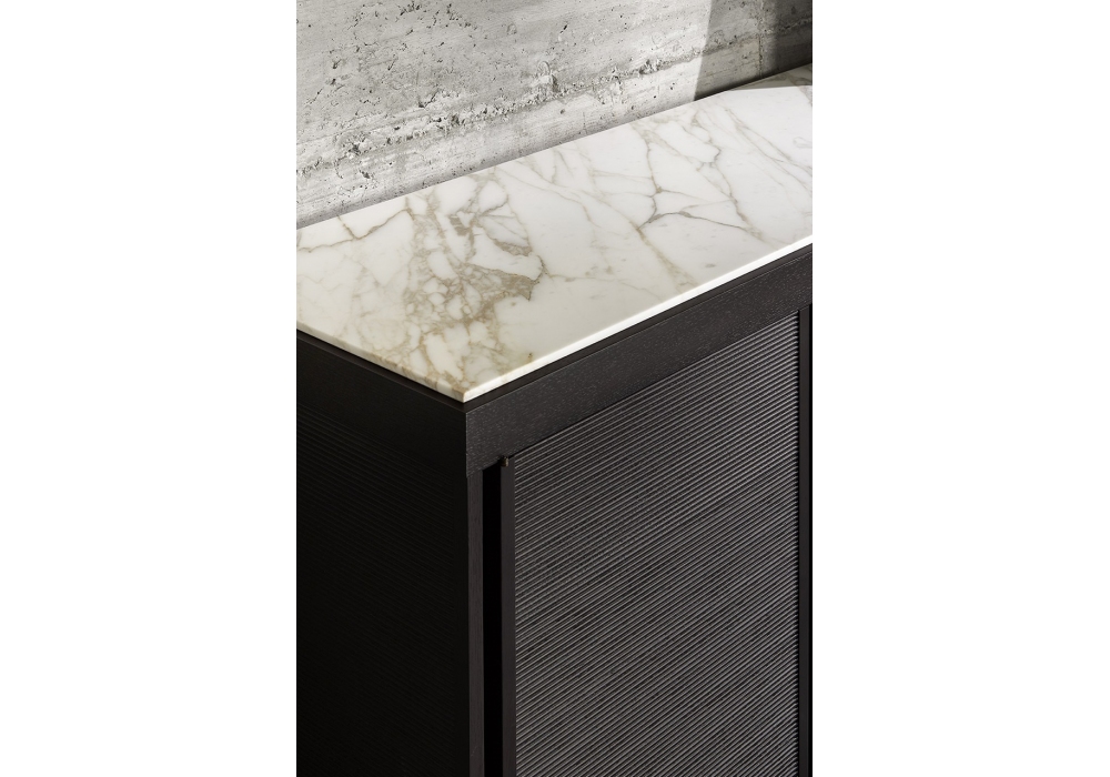 I.C.S. conçu par Roberto Lazzeroni pour Ceccotti Collezioni est un buffet à 4 portes, en noyer américain massif et contreplaqué plaqué, avec portes et panneaux latéraux rainurés. N°1 étagère interne en bois dans chaque compartiment, plateau en bois, quincaillerie en laiton nickelé satiné et cadre de base en acier inoxydable satiné. Sur demande plateau en marbre, quincaillerie et piètement en laiton bruni.