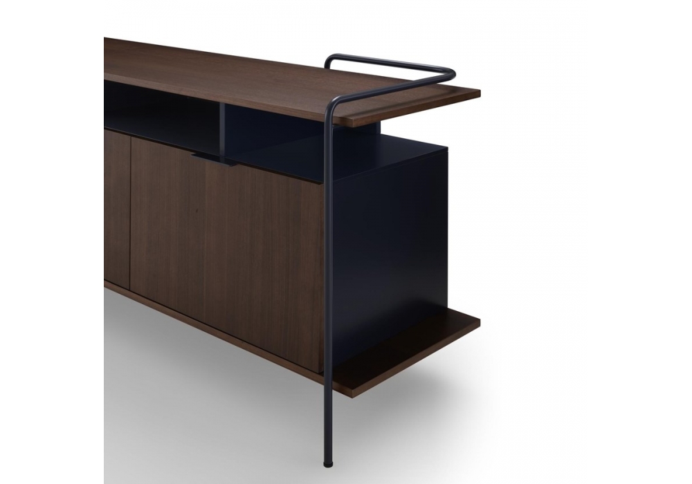 Alando conçu par Eric Jourdan pour Ligne Roset est un buffet du dynamisme subtil dérivant du contraste entre la structure tubulaire en métal et le noyer foncé du plateau. Disponible en différents modèles.