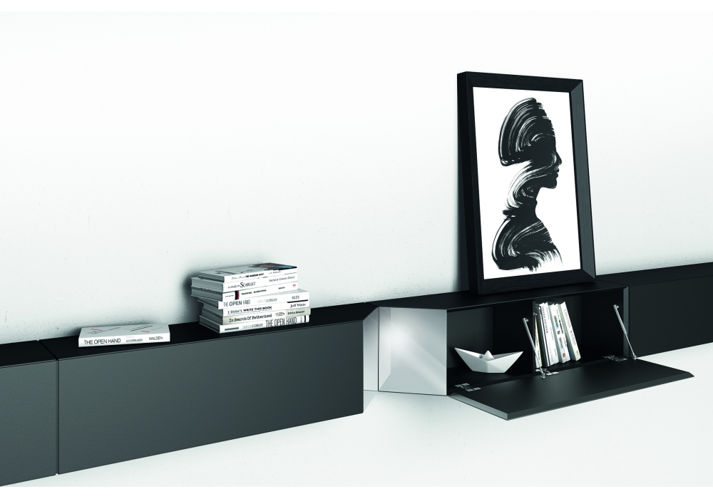 Canto conçu par DSH pour Minotti Italia est un conteneur suspendu en bois aggloméré, finition gaufrée disponible en différentes couleurs. L'épaule externe oblique peut être avec ou sans miroir et avec la possibilité de choisir la position: à droite ou à gauche. Ouverture de porte à rabat ou vasistas.