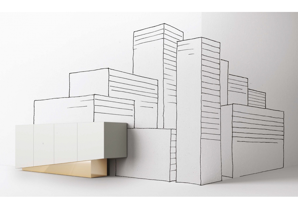Extra conçu par Simone Fanciullacci pour Minotti Italia est un buffet en bois aggloméré avec quatre portes, finition gaufrée disponible en différentes couleurs. Étagères internes en verre extra clair. Base satinée disponible en laiton ou nickel.
