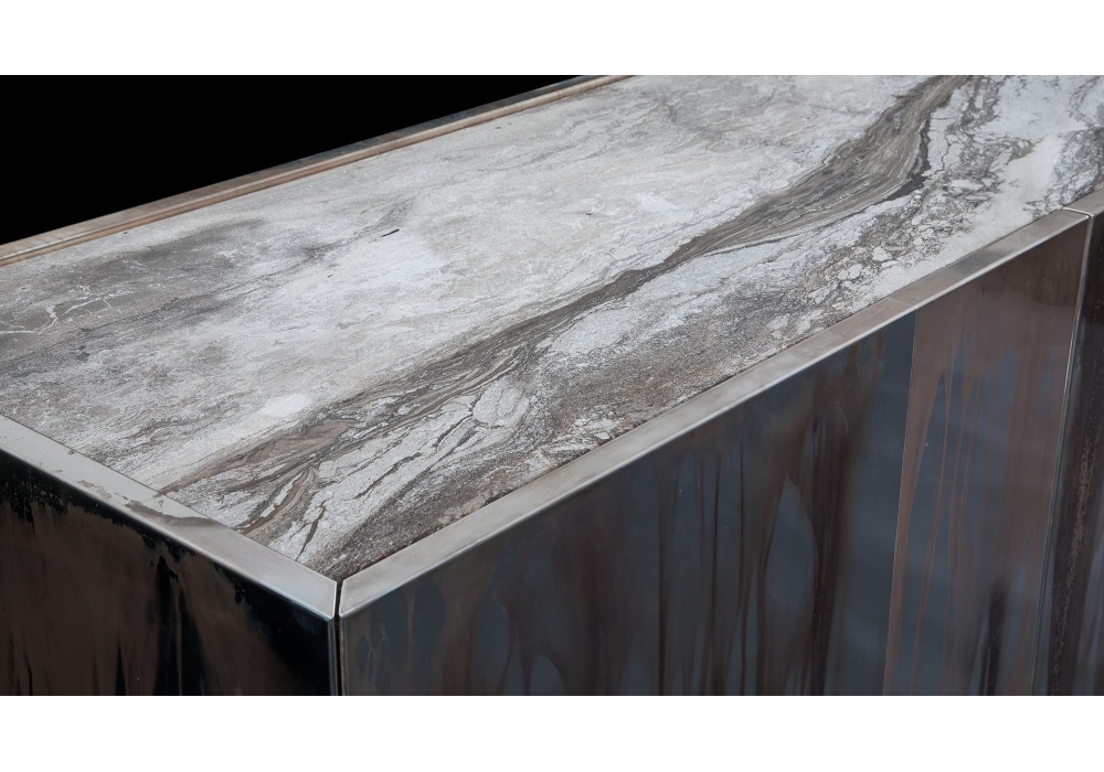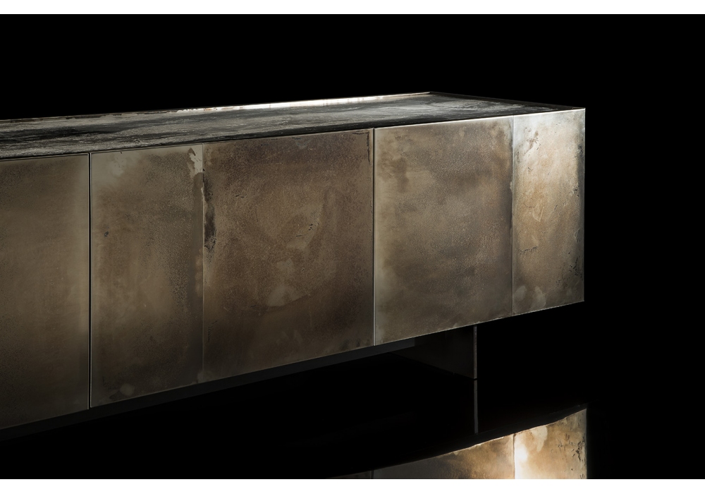 Side-X Evo conçu par Massimo Castagna pour Henge est un buffet composé d'une structure en bois massif. Portes affleurantes en bois massif ou recouvertes de métal. Plateau en bois ou pierre. Base en acier bruni noir. Le buffet est disponible en différentes dimensions et finitions. Éclairage LED disponible sur demande.