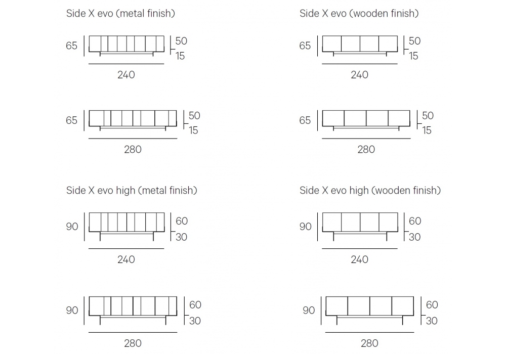 | Dimensions | 240 x 57 x H 65 cm; 280 x 57 x H 65 cm; 240 x 50 x H 90 cm; 280 x 50 x H 90 cm. |