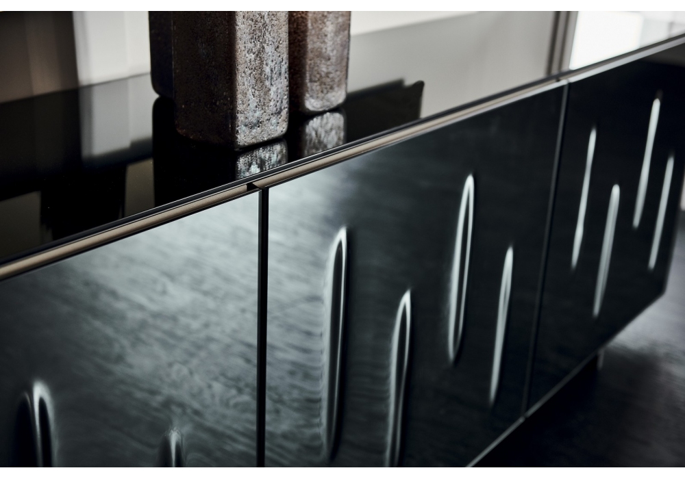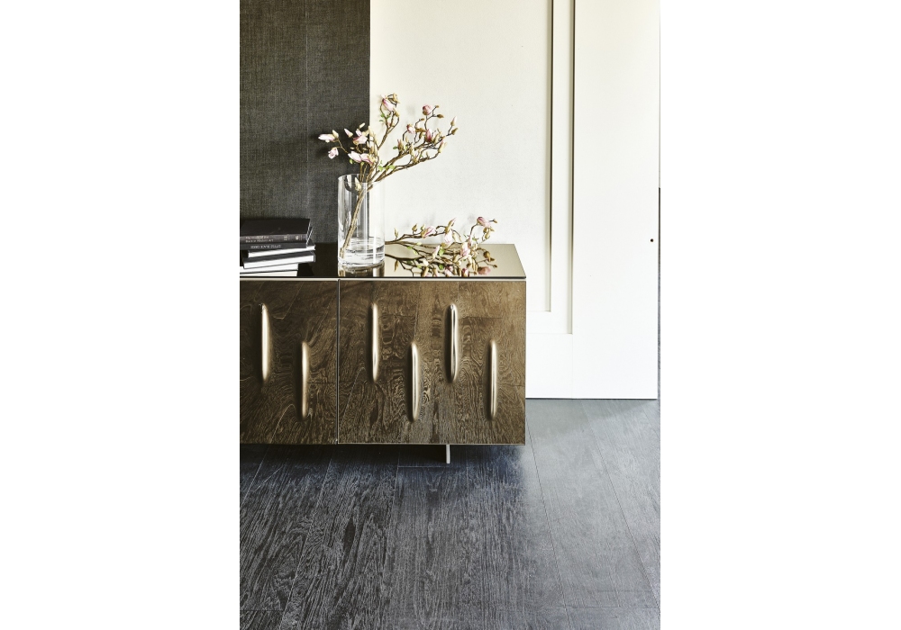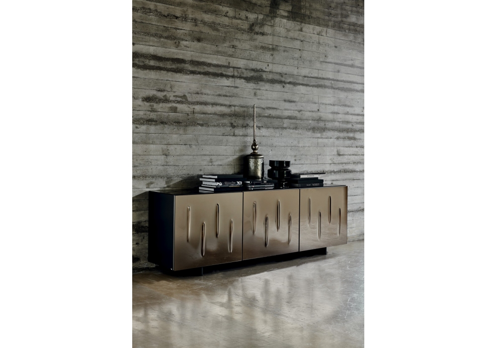 Carnaby conçu par R. Industrial Design pour Cattelan Italia est un buffet composé d'une structure en bois et de portes en verre convexe miroité fumé ou miroité bronze avec profilés en aluminium gaufré titane. Pieds en acier inoxydable poli ou en acier verni. Étagères internes en verre transparent. Disponible avec verre convexe miroité fumé ou miroité bronze avec profilés en aluminium gaufré titane.