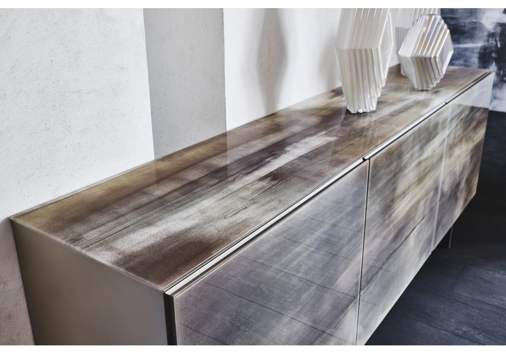 Focus Crystalart conçu par Paolo Cattelan pour Cattelan Italia est un buffet composé d'une structure en bois laqué et de portes en verre extra-clair avec impression artistique décorative avec profilés en aluminium gaufré titane. Pieds en acier inoxydable poli ou en acier verni. Étagères internes en verre transparent. Disponible avec plateau en verre dans la même finition des portes.