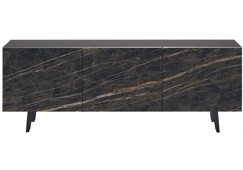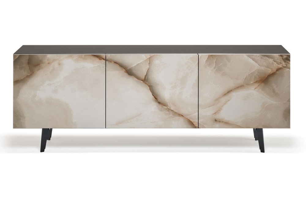 Metropol conçu par Paolo Cattelan pour Cattelan Italia est un buffet composé d'une structure en bois laqué et d'une base en acier verni de la même couleur que la structure. Portes en céramique Marmi en plusieurs coloris. Étagères internes en verre transparent. Disponible avec plateau en verre extra-clair dépoli laqué blanc, graphite ou noir ou en verre miroité bronze.