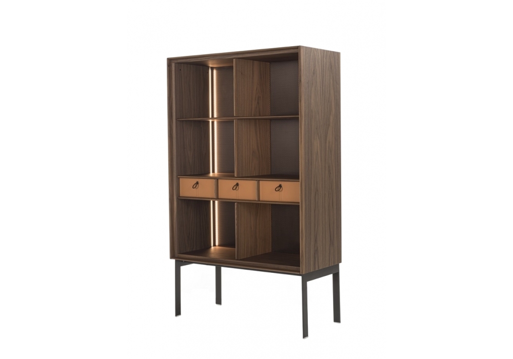 Matics 2 conçu par Gabriele & Oscar Buratti pour Porada est un buffet réalisé en noyer Canaletta, ouvert ou avec portes en verre argenté super clair Stopsol, avec structure en métal et base en finition gris étain. Panneau arrière disponible en bois, métal bronze gaufré ou Cuoio. Intérieur équipé d'un éclairage LED intégré dimmable via télécommande ou APP. Possibilité d'insérer max. trois tiroirs avec façades en bois ou Cuoio.