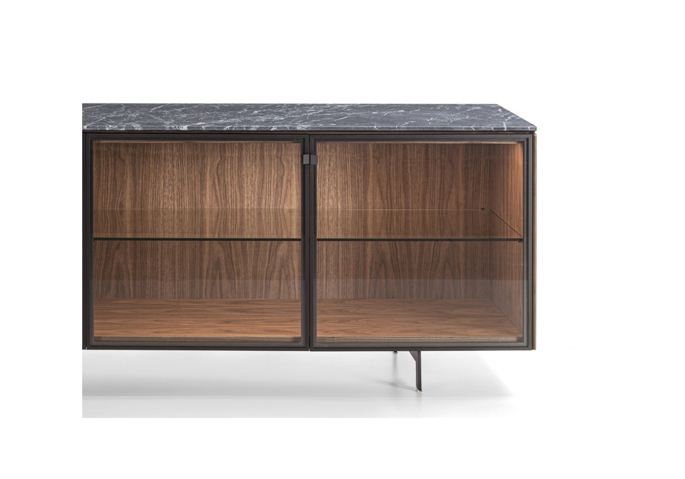 Matics 4 conçu par Gabriele & Oscar Buratti pour Porada est un buffet en noyer Canaletta avec quatre portes battantes en verre Stopsol argent super clair monté sur une structure en métal finition gris étain. Intérieur équipé d'un éclairage LED intégré dimmable via télécommande ou APP. Base en métal finition étain et plateau en bois ou marbre.