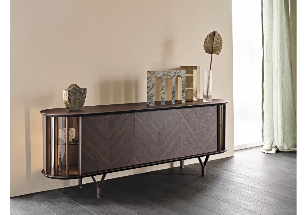 Costes conçu par Tosca Design pour Cattelan Italia est un buffet en bois disponible en noyer Canaletto ou en chêne brûlé. Inserts en métal laqué gaufré bronze. Base en acier laqué gaufré bronze. Étagères internes en verre fumé.