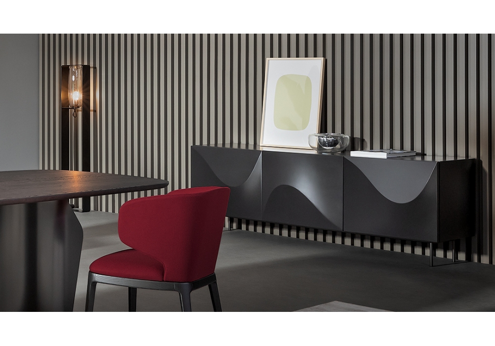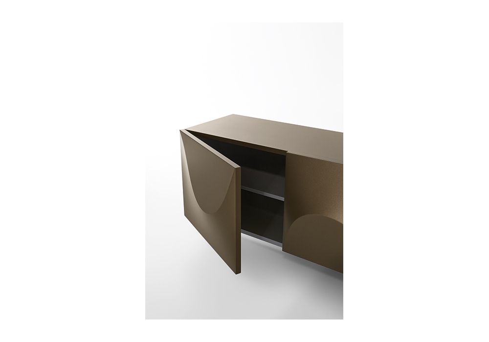 Vertigo conçu par Dondoli e Pocci pour Bonaldo est un buffet avec structure externe en bois laqué mat, portes en polyuréthane structurel laqué et base en métal peint, disponible en deux tailles et en 3 combinaisons de couleurs. Le buffet est réalisé avec une base plinthe ou avec des pieds. Les étagères internes sont en bois mélaminé (sur demande, également disponible en verre transparent).