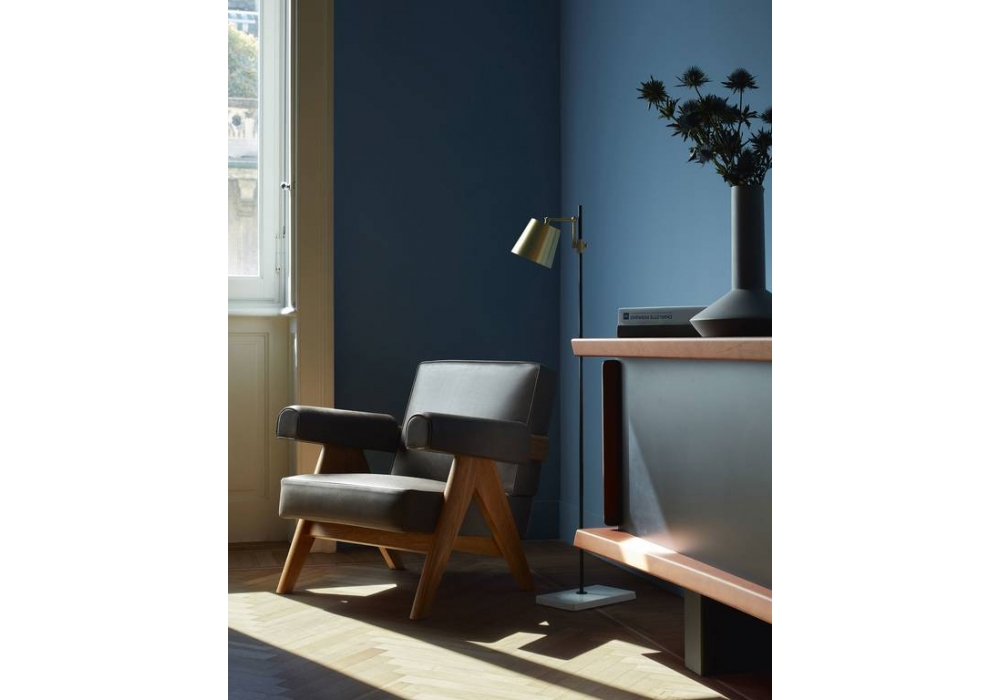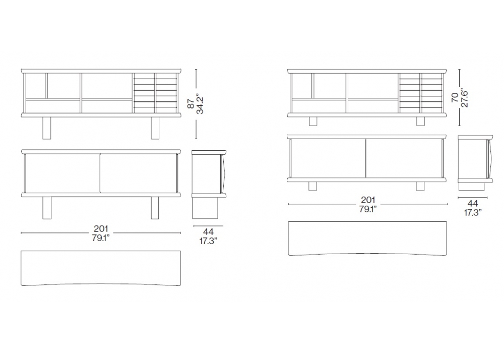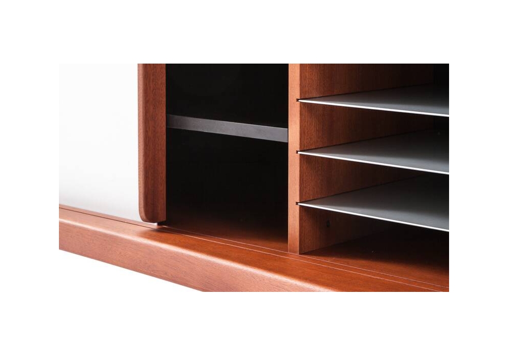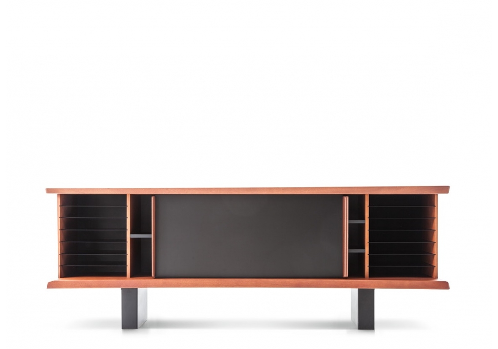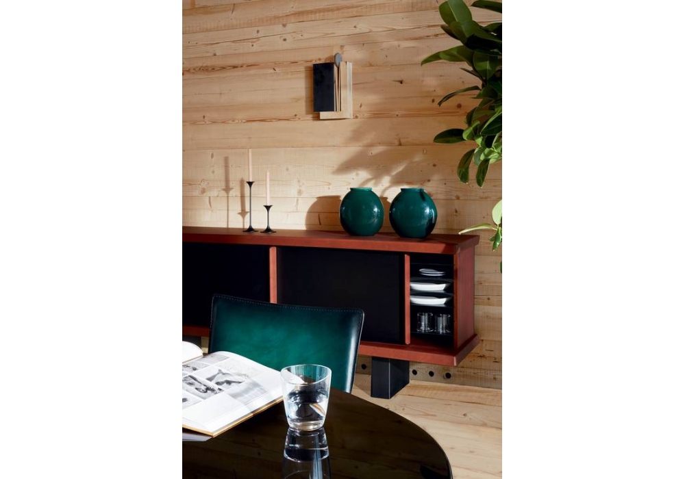 513 Riflesso conçu par Charlotte Perriand pour Cassina est un meuble conteneur avec une structure et des pieds en MDF, des portes et des étagères en aluminium anodisé et des poignées en hêtre massif. La version est laquée noire à l'extérieur et bordeaux à l'intérieur ; la version en acajou massif, avec côtés en acajou, fond et intérieur noirs.