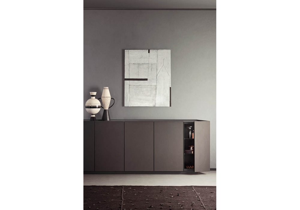 Cornice conçu par Pianca est un buffet avec ouverture en cercueil des portes latérales extérieures. Fabriqué en bois d'Essenza ou laqué ou recouvert de cuir synthétique, socle en finition ardoise mate et étagères internes en verre transparent au plomb. Disponible en différents modèles.