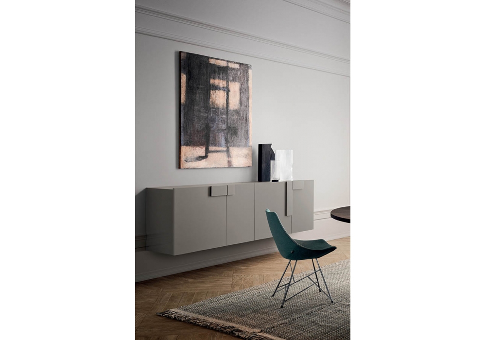 Ginevra conçu par Pianca est un buffet composé de portes élancées qui dépassent de la structure, articulées sur des charnières cachées. Étagères intérieures en verre. Les poignées larges et expressives, carrées ou rectangulaires, peuvent être jointes pour former des compositions géométriques changeantes en combinaison ou en contraste avec les portes. Les finitions laquées, bois ou métal permettent également de distinguer le piètement. Disponible en différents modèles.