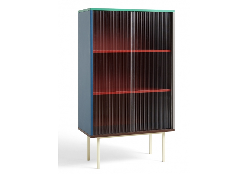 Color conçue par Muller Van Severen pour Hay est une vitrine avec des panneaux Valchromat laqués UV multicolores, une structure en tube d'acier enduit de poudre et des portes en verre trempé transparent nervuré. Disponible en différentes finitions.