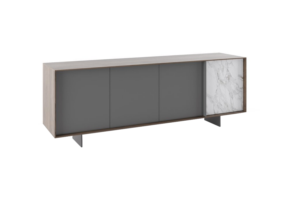 Try conçu par Gualter Torres pour Gual Design est un buffet avec structure en MDF plaqué noyer, avec 3 ou 4 portes laquées grises et porte droite recouverte de calacatta mat. Pieds en fer. Il est possible d'ajouter le tiroir interne. Disponible en différentes dimensions.