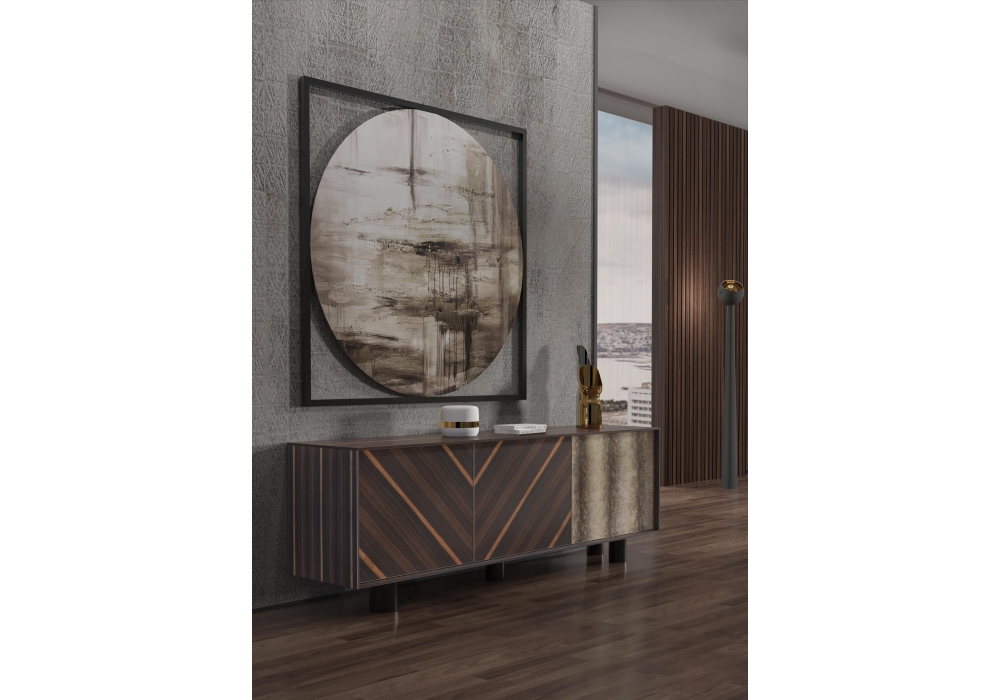 Jones conçu par Gualter Torres pour Gual Design est un buffet avec structure en placage d'eucalyptus à 3 ou 2 portes, avec 1 étagère interne en verre dans chaque compartiment et pieds en fer peint en noir. Il est possible d'ajouter le tiroir interne comme accessoire. Disponible en différentes dimensions.