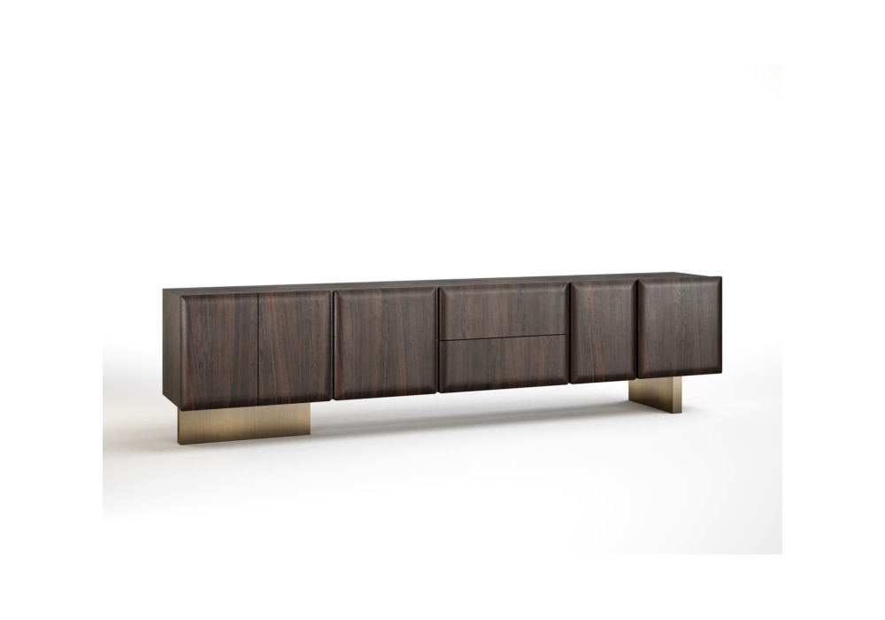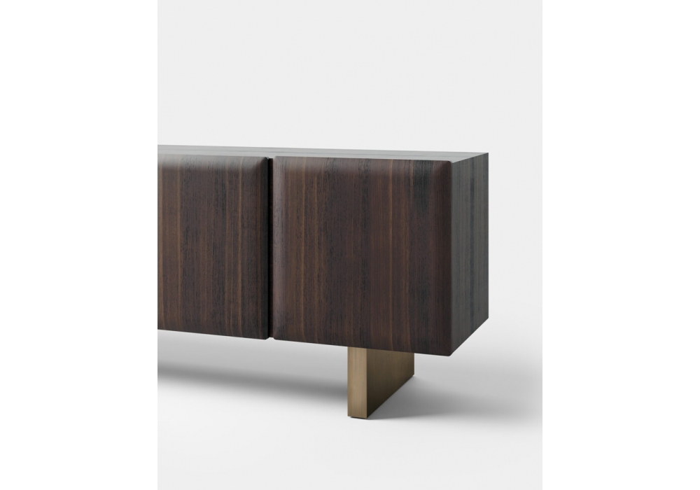Aiko conçu par Giuliano et Gabriele Cappelletti pour Emmemobili est un buffet en bois de chêne, avec portes et tiroirs à façades façonnées, Proposé avec base en bois ou recouvert de laiton. Disponible en différentes versions et différentes tailles.
