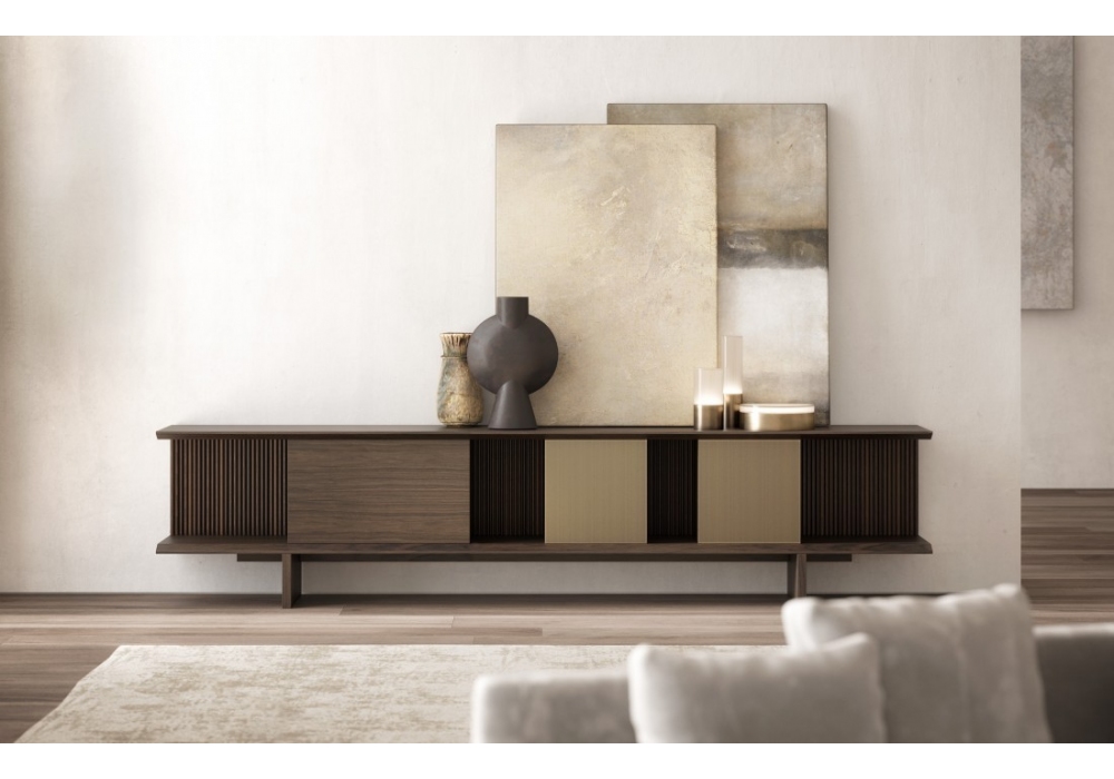 In-Finito conçu par Elena Pancaldi pour Emmemobili est un buffet en contreplaqué plaqué de différentes finitions, disponible en trois tailles différentes, avec portes ou avec portes et tiroirs, avec façades en bois ou recouvertes de laiton. Compartiments fermés équipés d'une étagère dans la même finition que la structure.