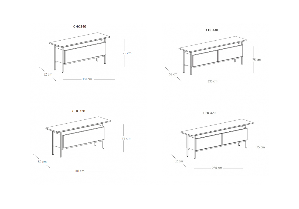 | Dimensions | 161 x 52 x H 75 cm, 181 x 52 x H 75 cm; 210 x 52 x H 75 cm; 230 x 52 x H 75 cm; |